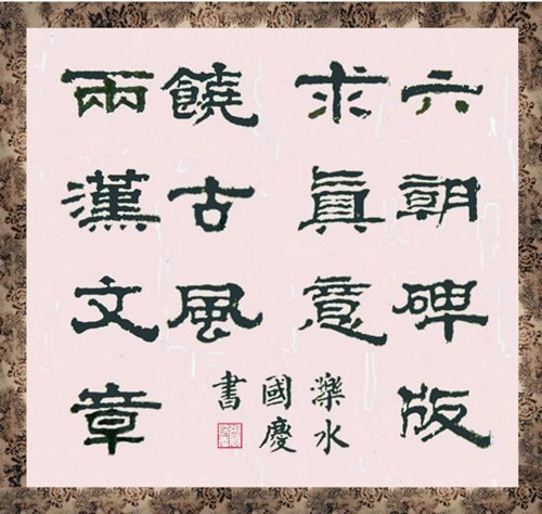 张国庆,男,1951年出生, 汉语言文学毕业,钟爱文学与书法。五岁习书,逐临欧柳颜赵,打下坚实基础。后四十余年的学习、工作,忙忙碌碌难得日日临池。离岗后,2006年以二十种书体字体的书法作品展览33天的形式步入书法界。2011年,以100余幅作品组成的《国庆书法50体》网络版问世。以人民大众广泛喜爱的楷书、隶书、行草书为主体的“国庆书法”,已经和正在形成自己独特的、而又是历代书法家所集中推崇的 “清整、温润、闲雅、沉实” 的风格。 “国庆书法”励志将为中国书法的继承与发展作出应有的装裱机贡献。